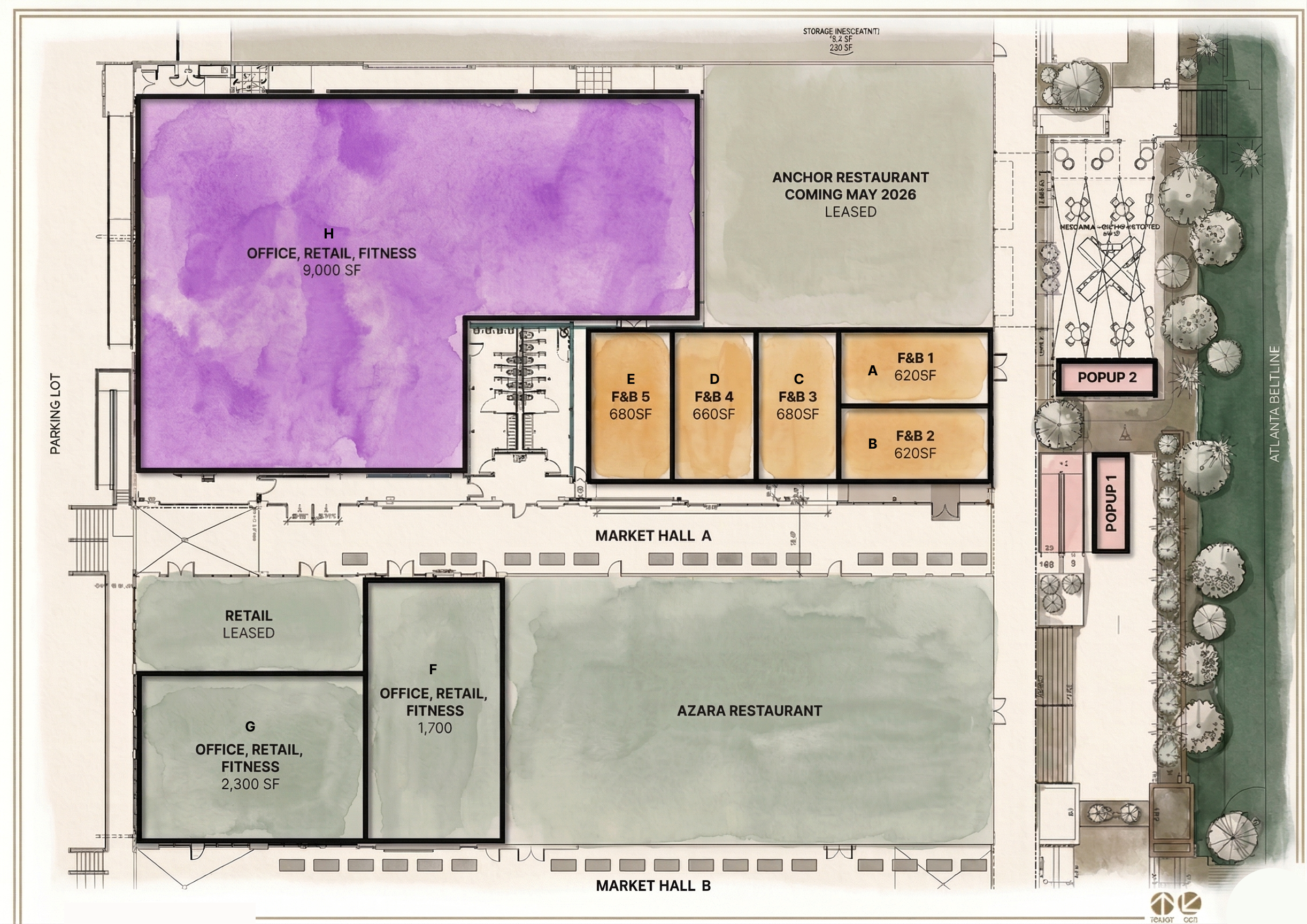 The anchor restaurant opens May 2026. The remaining food & beverage suites, retail spaces, and BeltLine-facing popup positions are available now — for operators who want to be first, not next.